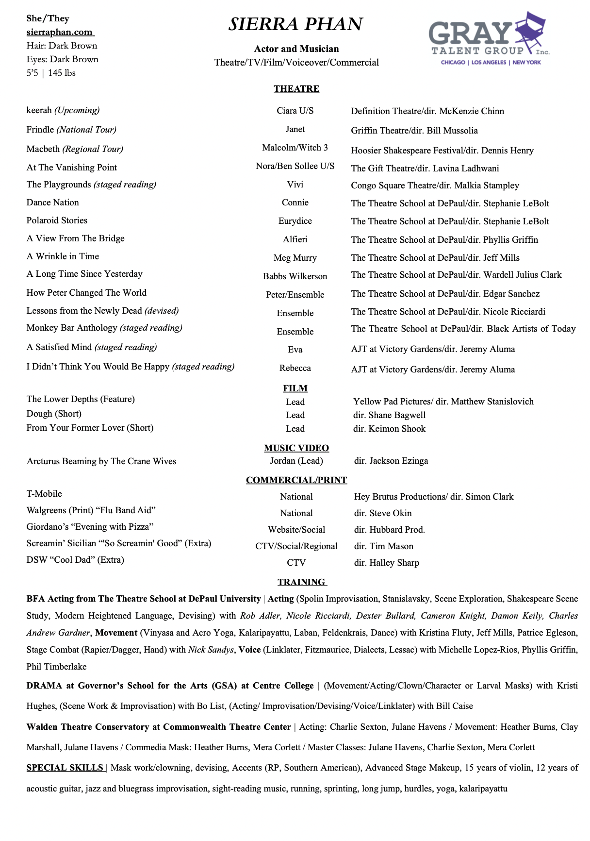 Sierra Phan (She/They) is a Chicago-based actor with a BFA in Acting from The Theatre School at DePaul University, a graduate from Kentucky Governor’s School for the Arts in Drama and the Commonwealth Theatre Center of Kentucky. She was born and raised in Kentucky. Her father is African American, and her mother is first-generation Vietnamese and white. Inspired by the cultural vibrancy of her working class upbringing and love for storytelling, she moved to Chicago to pursue the art of acting.Her work spans theatre, commercial, and film, including classical and contemporary productions as well as short films. Some of her Theatre School at DePaul work includes productions such as Dance Nation, Polaroid Stories, A View From The Bridge, A Wrinkle in Time, A Long Time Since Yesterday and others. Other Theatre credits include: Macbeth (Hoosier Shakespeare, Regional Tour), Frindle (Griffin Theatre, National Tour), At The Vanishing Point (The Gift Theatre). Additional staged readings include: The Playgrounds (Congo Square), A Satisfied Mind and I Didn't Think You Would Be Happy (Victory Gardens). Commercial credits include projects for T-Mobile, Giordano's, Walgreens, and more. Her training includes movement-based performance, scene study, improvisation, voice and dialect work, and stage combat. In addition to acting, Sierra has experience in classical violin, bluegrass improvisation, and acoustic guitar. She continues to pursue work in theatre, film, and new collaborative projects. She strives to bring soul, honesty, joy and vulnerability to each project she's part of. Sierra is represented by Gray Talent Group.All I strive for every day is in honor of the memory of my older sister, Asia Phan. In every story and beyond.